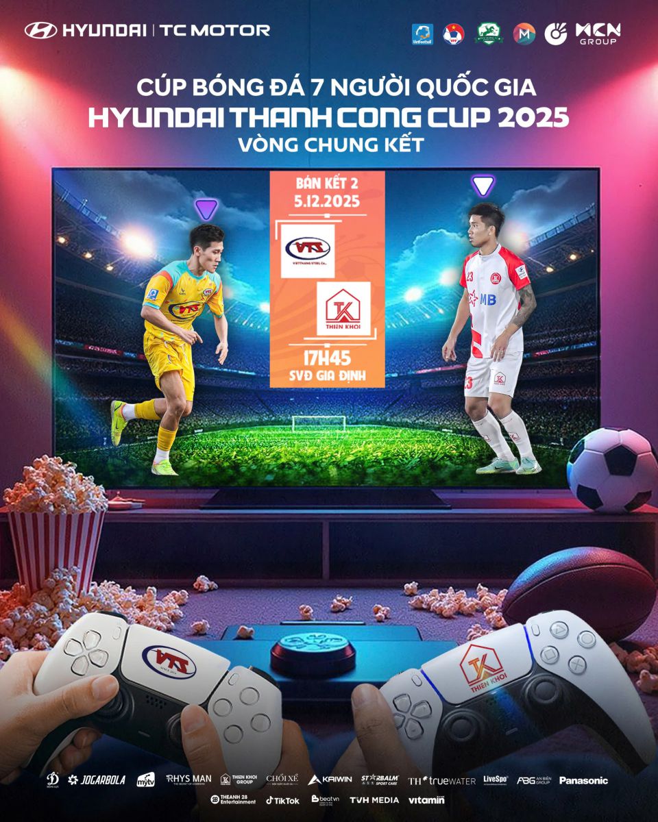 Trận Bán kết 2 của Vòng chung kết Cúp bóng đá 7 người Quốc gia Hyundai Thành Công Cup 2025 sẽ là cuộc đụng độ của hai nhà vô địch khu vực miền Nam - Thép Việt Thắng và miền Bắc - Thiên Khôi FC.