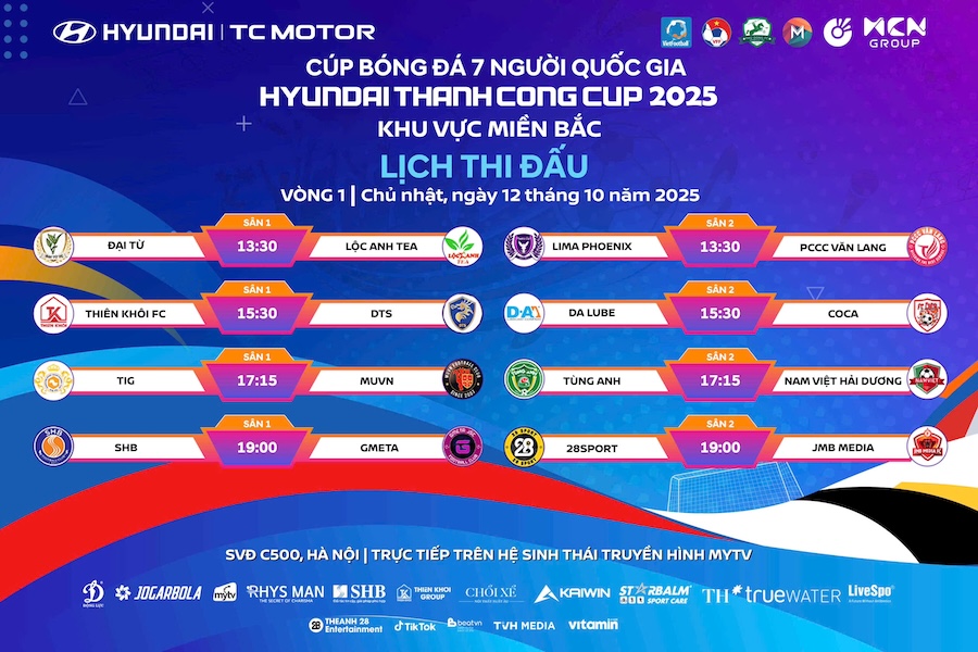 Tại vòng đấu đầu tiên diễn ra ngày 12/10/2025, Đại Từ - Lộc Anh Tea và Lima Phoenix – PCCC Văn Lang sẽ thi đấu trận mở màn. Lượt đấu khai mạc chứng kiến cuộc đọ sức của Thiên Khôi FC – DTS và Da Lube – Coca. Các trận đấu còn lại là màn so tài của: TIG – MUVN, Tùng anh – Nam Việt Hải Dương, SHB – Gmeta, 28Sport – JMB Media.
