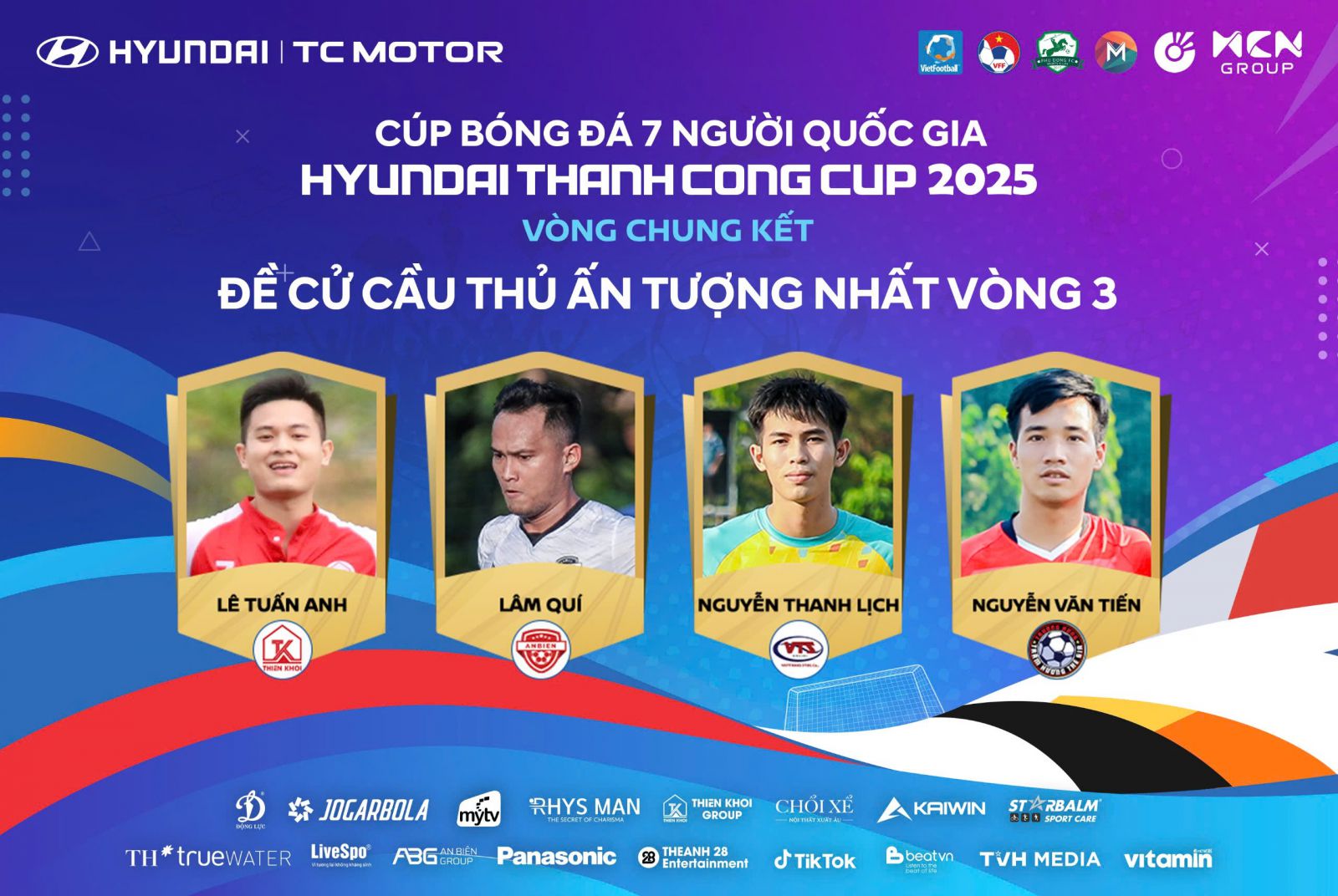 Bình chọn cầu thủ ấn tượng nhất vòng 3 Vòng Chung kết Cúp bóng đá 7 người Quốc gia Hyundai Thành Công Cup 2025.