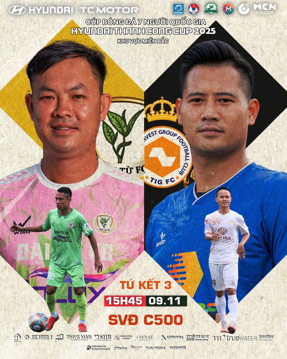 Sau hành trình tại vòng đấu bảng, cặp đấu duyên nợ Đại Từ và TIG lại một lần nữa đụng độ nhau tại Tứ kết Cúp bóng đá 7 người Quốc gia Hyundai Thành Công Cup 2025 - Khu vực miền Bắc.