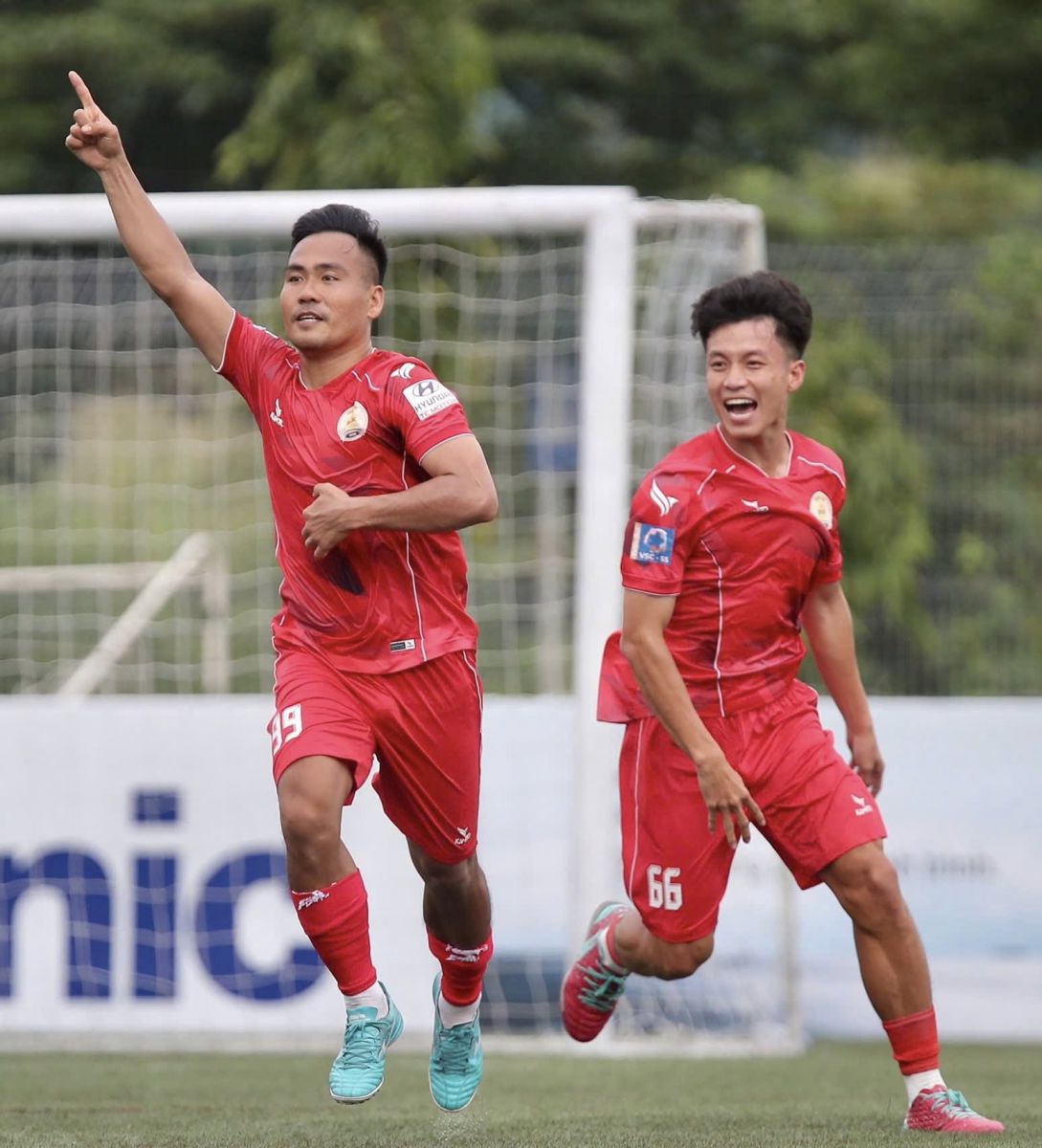 Sau cú chạm ở cột 2 làm rung mành lưới của Nghiêm Phạm Holdings, Dương Văn An cùng đồng đội chạy khắp sân trong tiếng hò reo của người hâm mộ Xây dựng Phan Kha trên khán đài.